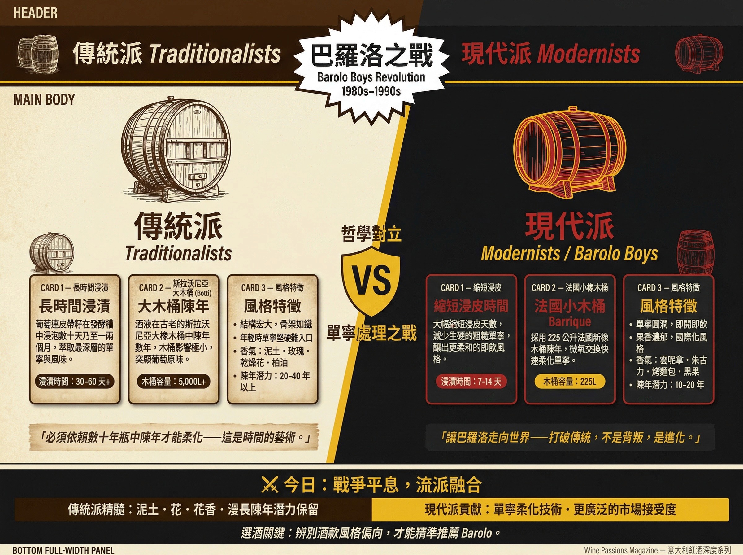 現代派(Modernists): 為了迎合國際市場對「即開即飲」與果香濃郁風格的追求,一群年輕的叛逆釀酒師(即 Barolo Boys)引入了現代工藝。他們大幅縮短浸皮時間以減少生硬的單寧,並改用 225 公升的「法國小橡木桶(Barrique)」進行陳年。法國新木桶不僅能透過微氧交換快速柔化單寧,更為這款意大利紅酒之王增添了雲呢拿、烤麵包與朱古力等甜美的現代氣息。