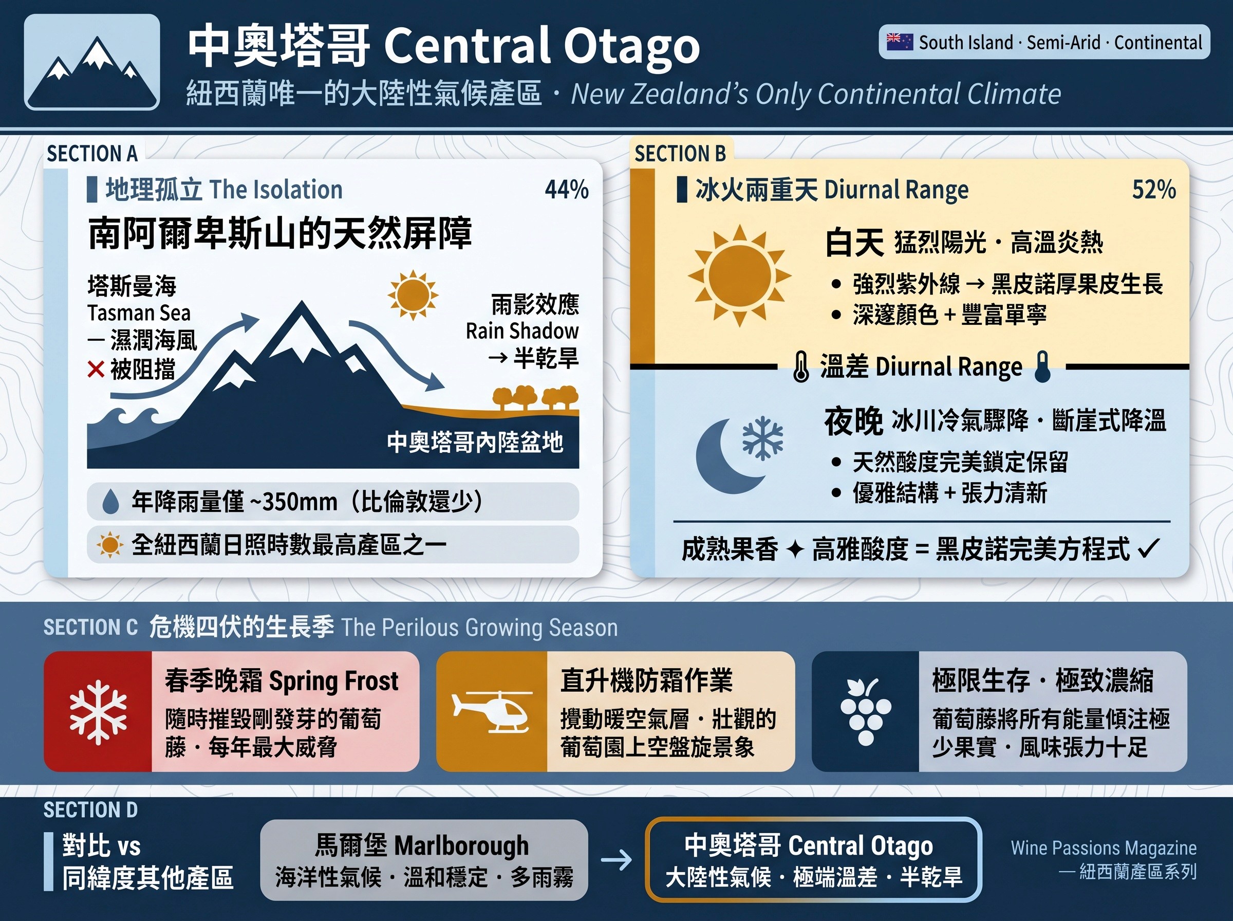 紐西蘭絕大多數的葡萄酒產區(如馬爾堡 Marlborough)都深受海洋調節的影響,氣候相對溫和。然而,中奧塔哥卻是一個極端的例外。它深處南島內陸,被雄偉的南阿爾卑斯山脈(Southern Alps)層層包圍,阻擋了來自塔斯曼海的雨水與溫和海風。