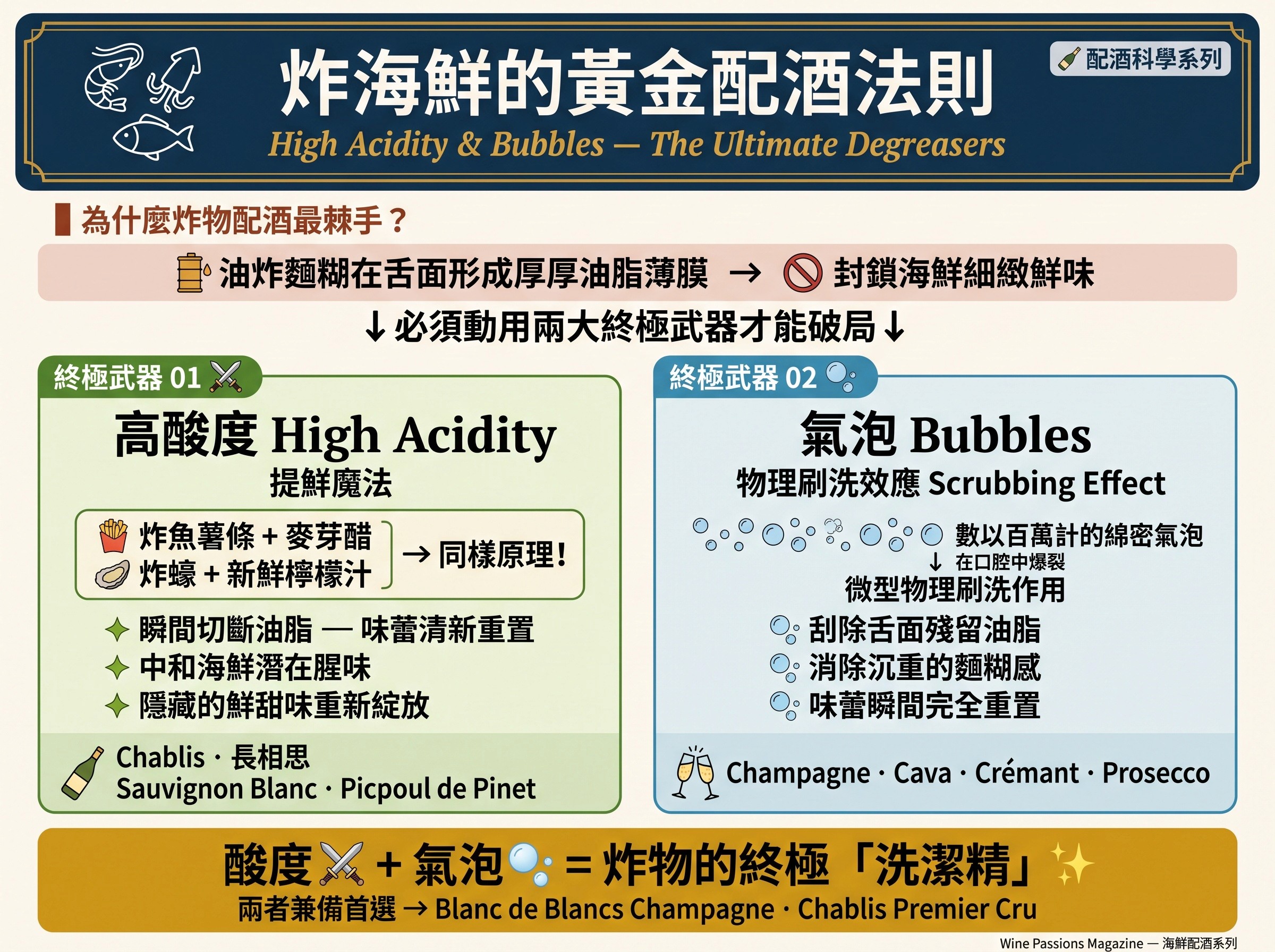 1. 炸海鮮的黃金配酒法則:酸度與氣泡是終極「洗潔精」