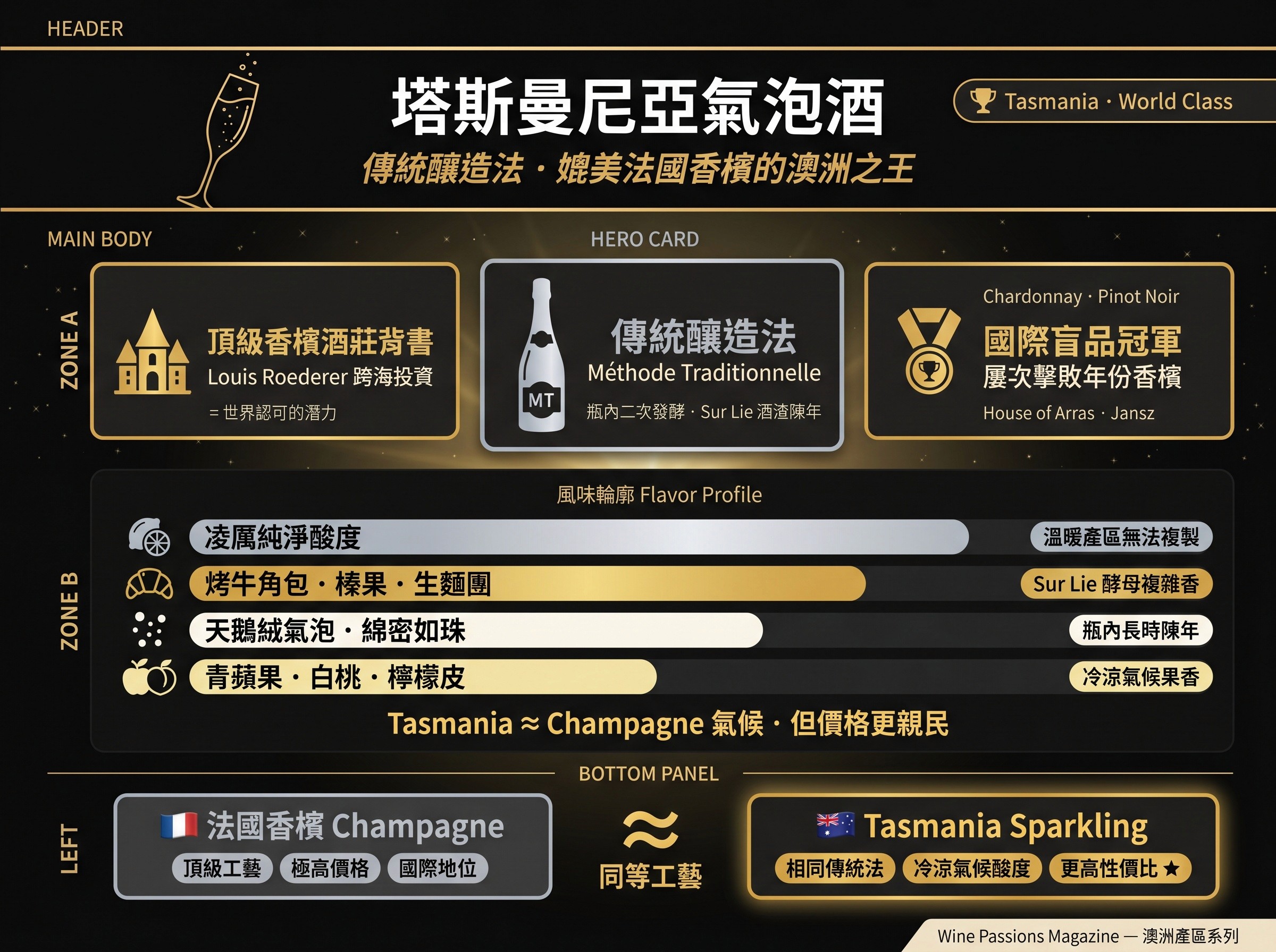 如果說塔斯曼尼亞有一張閃耀全球的名片,那絕對是它的氣泡酒(Sparkling Wine)。這裡的氣候條件與法國香檳區有著驚人的相似之處,甚至連香檳區的頂級酒莊(如 Louis Roederer)也紛紛跨海來此投資買地,足以見證其無可估量的潛力。