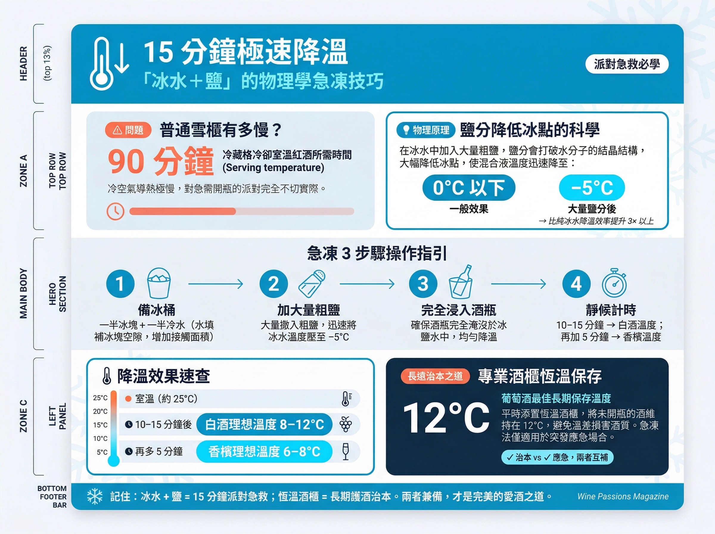 將酒瓶完全浸入這個「冰水+鹽」的混合物中,只需短短 10 到 15 分鐘,就能迅速將室溫的酒液降至完美的白酒溫度,再多放 5 分鐘甚至能達到極低要求的香檳溫度。這個方法不僅降溫效率驚人,且降溫過程均勻,絕對是每位愛酒人士在處理突發狀況時必須掌握的急救技巧。當然,平時添置專業酒櫃,將未飲用的酒維持在長期穩定的 12°C 葡萄酒保存溫度,依然是愛護佳釀的治本之道。