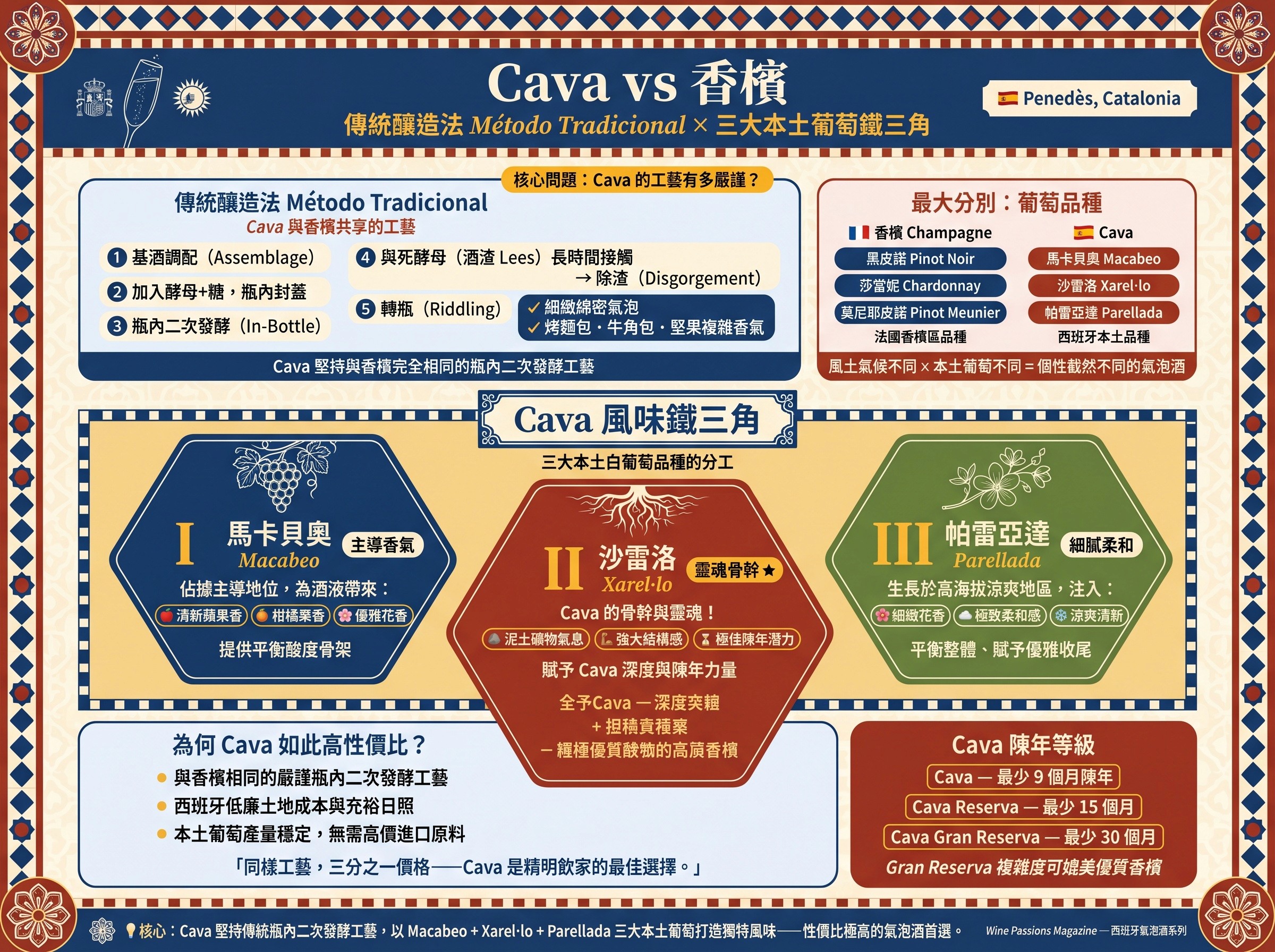 Penedès(佩內德斯)Cava 氣泡酒大解密:西班牙平價香檳替代品!採用傳統瓶中二次發酵法,以 Macabeo、Xarel·lo、Parellada 三大本土葡萄釀造,帶來細膩氣泡與清新果香。從 Brut 到 Gran Reserva,一次看懂甜度與陳年分級,是派對、婚宴最划算的高質氣泡酒!