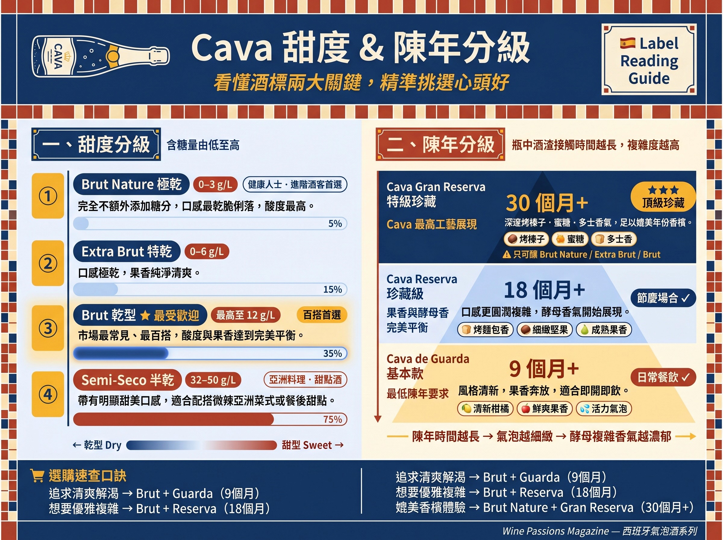 在酒舖選購 Cava 時,酒標上通常會標示兩個關鍵資訊:「甜度」與「陳年時間」。只要看懂這兩個標籤,您就能精準挑選到符合口味的佳釀。