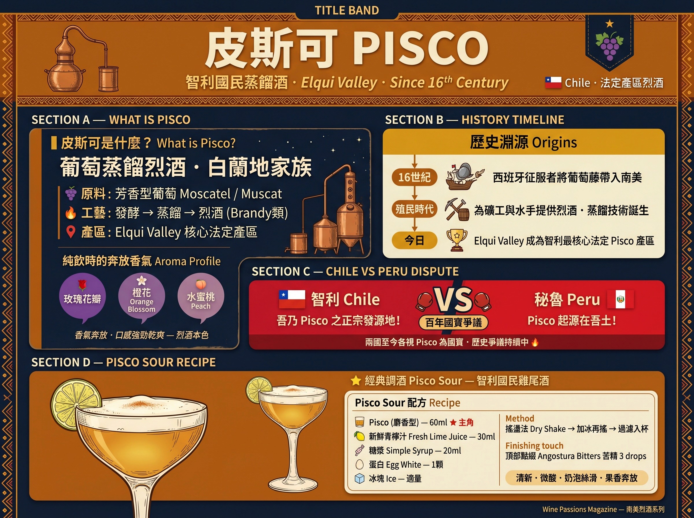 Pisco 的歷史淵源: 早在 16 世紀,西班牙征服者將葡萄藤帶來南美洲。為了消耗釀酒後剩餘的葡萄,同時為礦工與水手提供烈酒,當地人開始了蒸餾工藝,逐漸演變成今天的 Pisco。(註:智利與秘魯至今仍對 Pisco 的發源地與正宗地位有著激烈的歷史爭議,兩國皆視其為國寶。)
