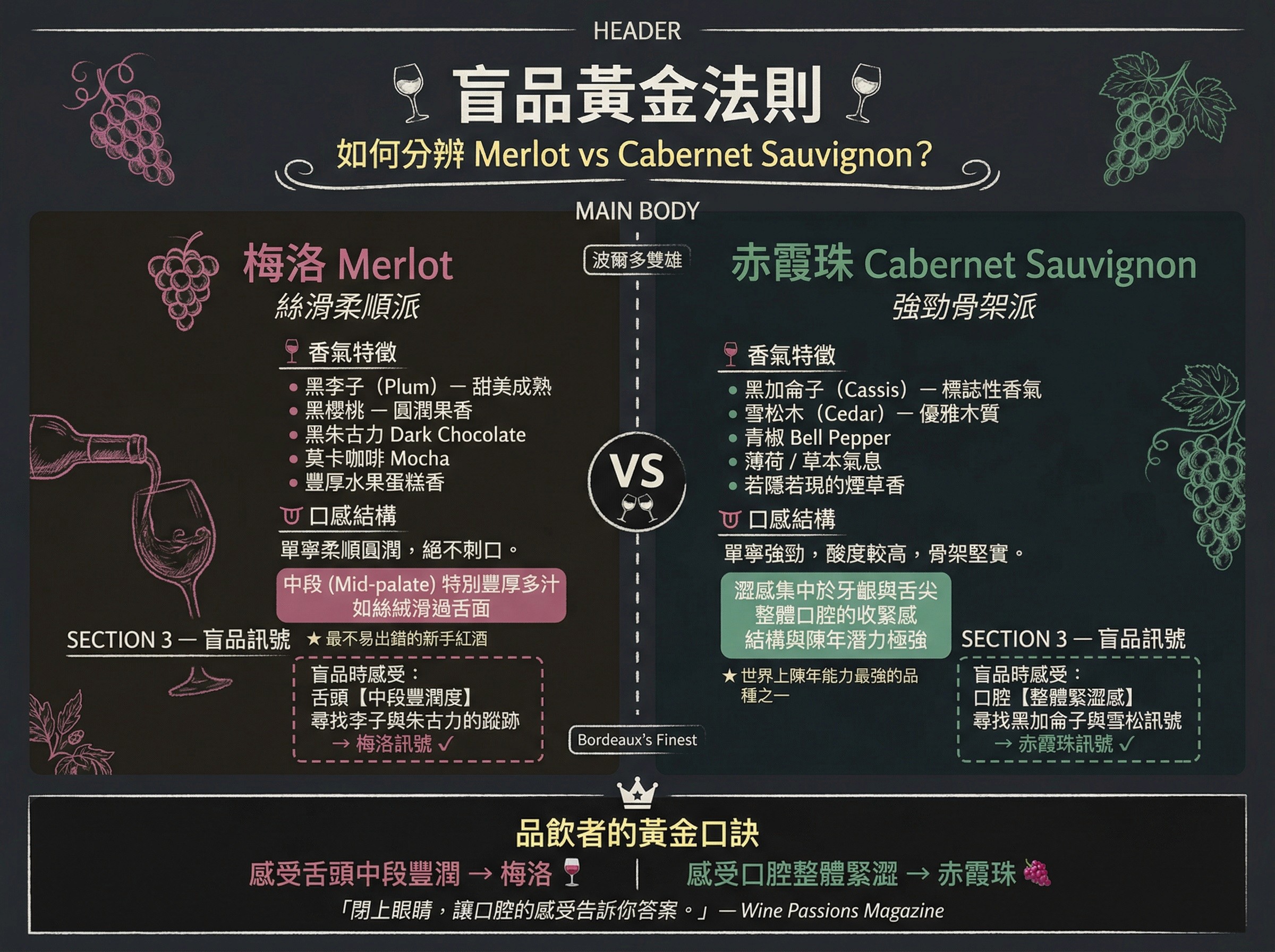 在專業的盲品桌上,Merlot vs Cabernet 是最經典、也是最考驗品飲者功力的對決。雖然兩者常在波爾多的混釀木桶中形影不離,但作為單一品種的表現,卻有著涇渭分明的性格分水嶺。