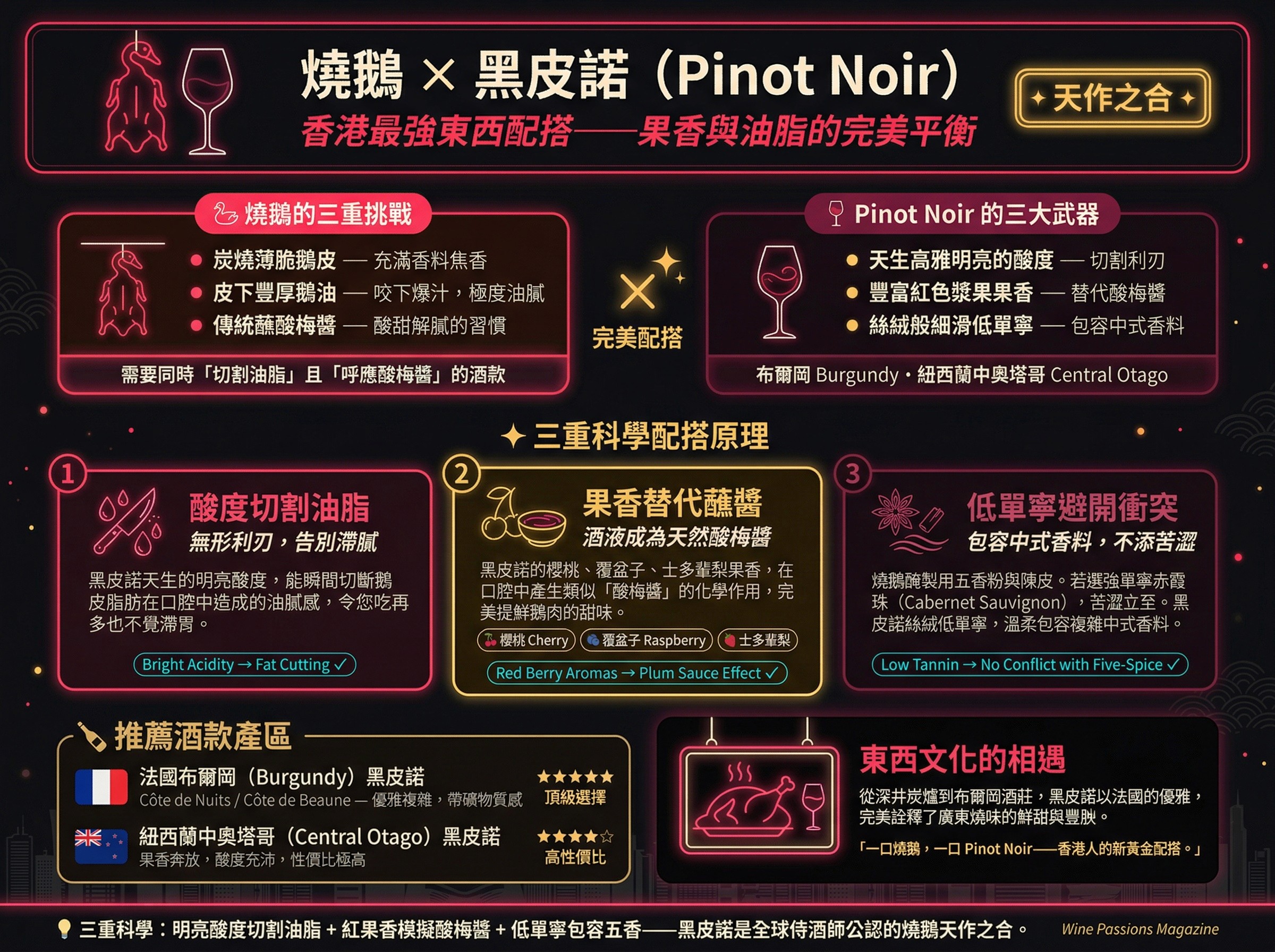 在尋找燒鵝的完美紅酒配搭時,我們需要一款能同時做到「切割油脂」與「呼應酸梅醬」的酒款。法國布爾岡(Burgundy)或是紐西蘭中奧塔哥(Central Otago)的黑皮諾(Pinot Noir),絕對是被全球侍酒師公認的燒鵝天作之合。