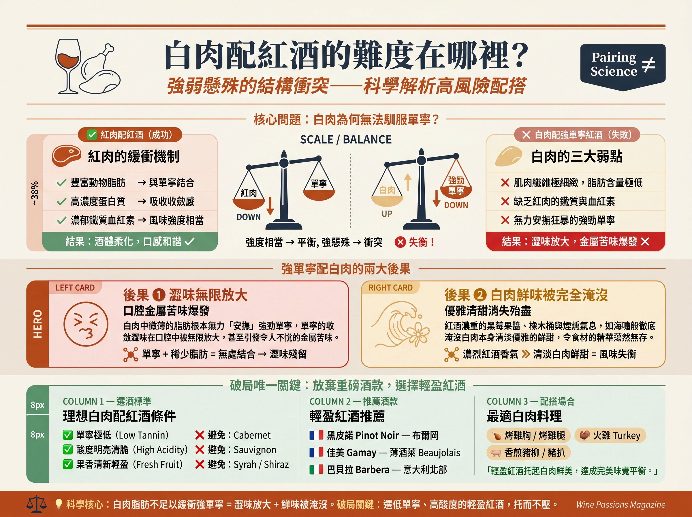 要成功挑戰紅酒配白肉,我們首先必須從科學與味覺的角度,深刻理解這項搭配的「高風險」究竟從何而來。