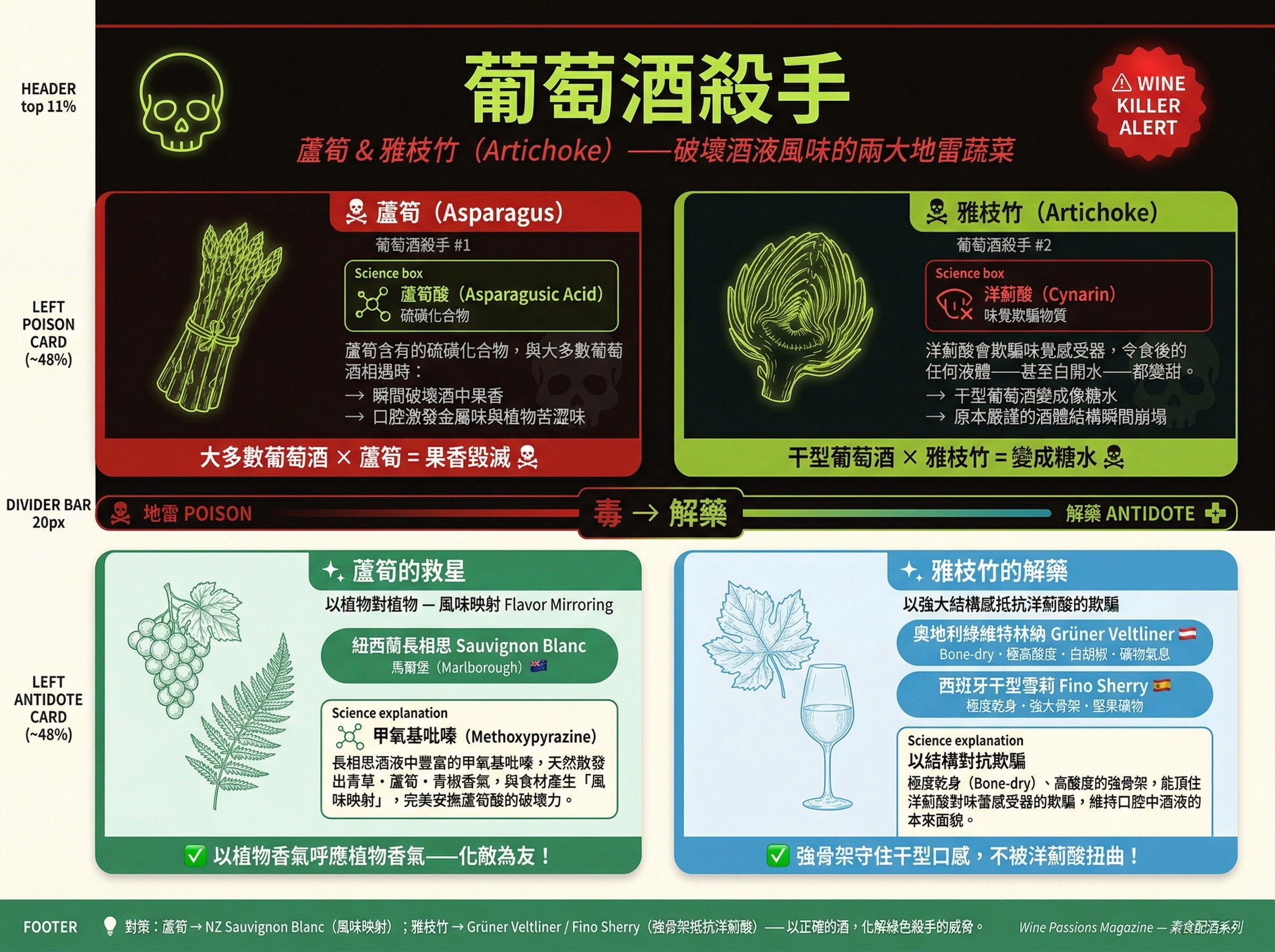蘆筍的「蘆筍酸」: 蘆筍含有一種名為「蘆筍酸(Asparagusic acid)」的硫磺化合物。當這種物質與大多數葡萄酒相遇時,會瞬間破壞酒中的果香,並在口腔中激發出一股極度難聞的金屬味與植物的苦澀味。
